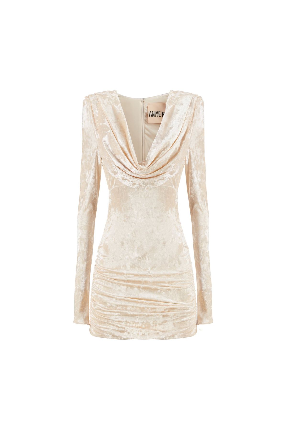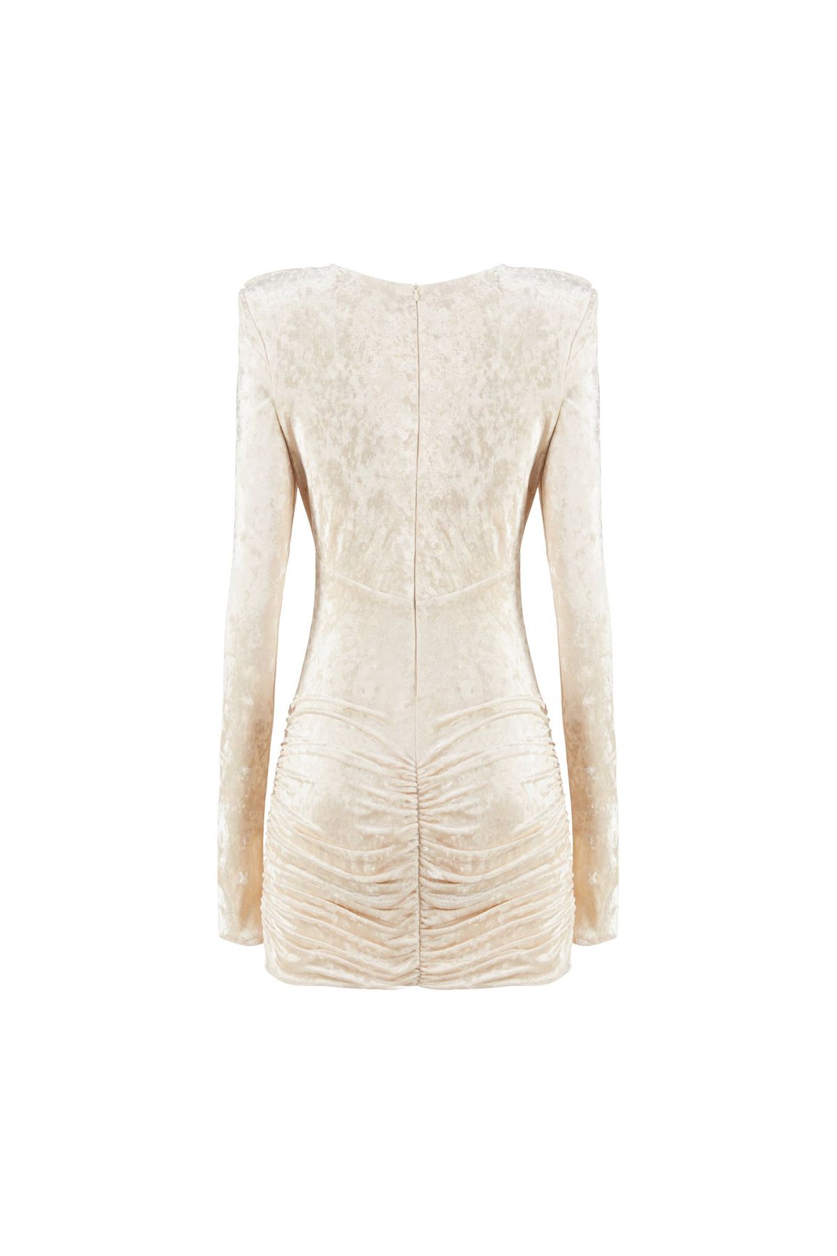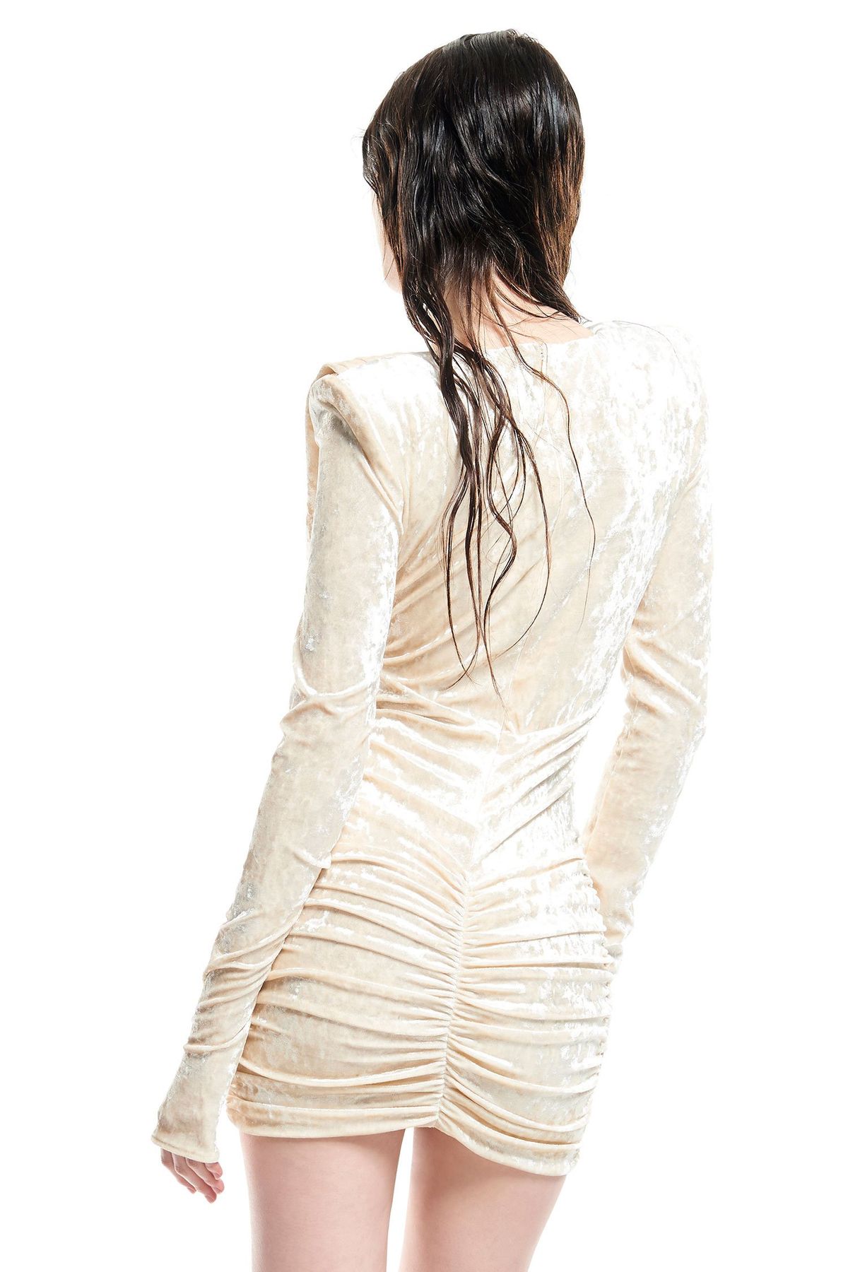 Abito corto in velluto strech, con gonna arricciata e scollatura ampia e morbida