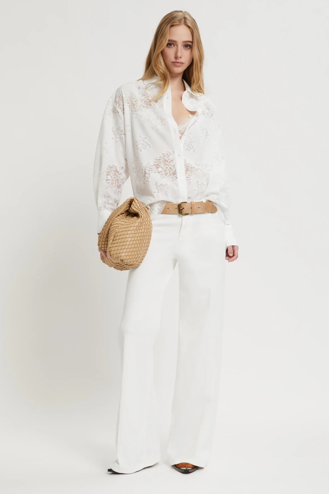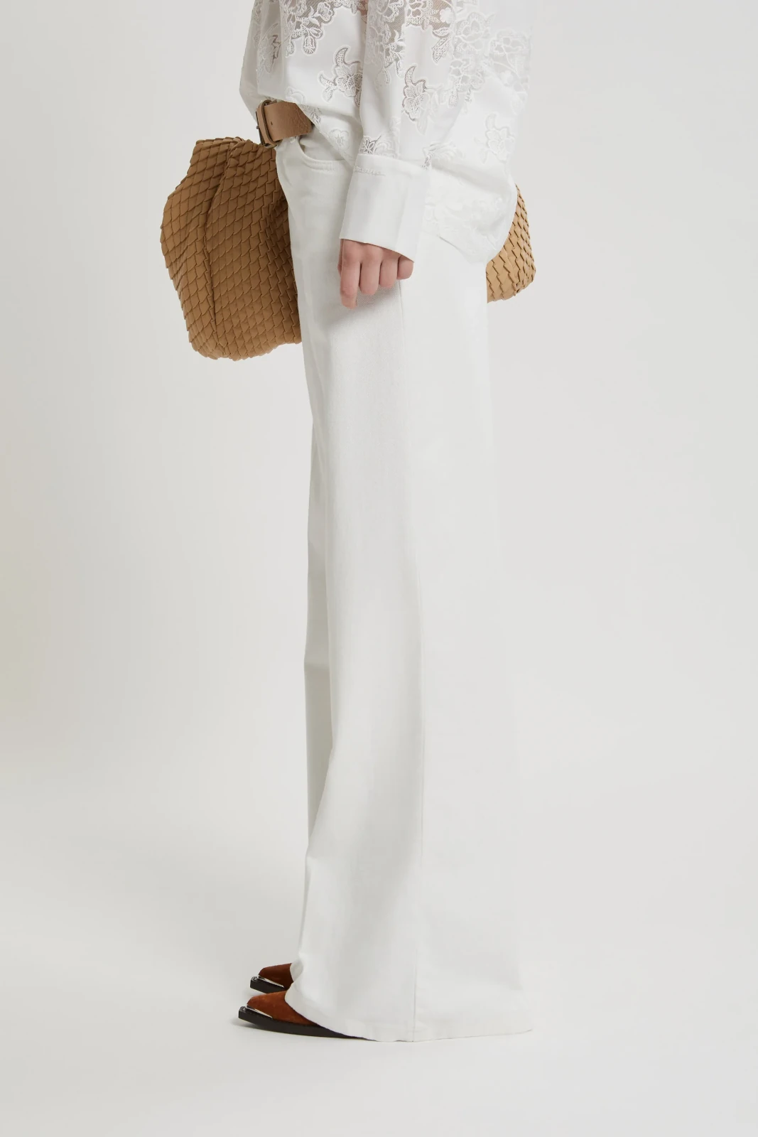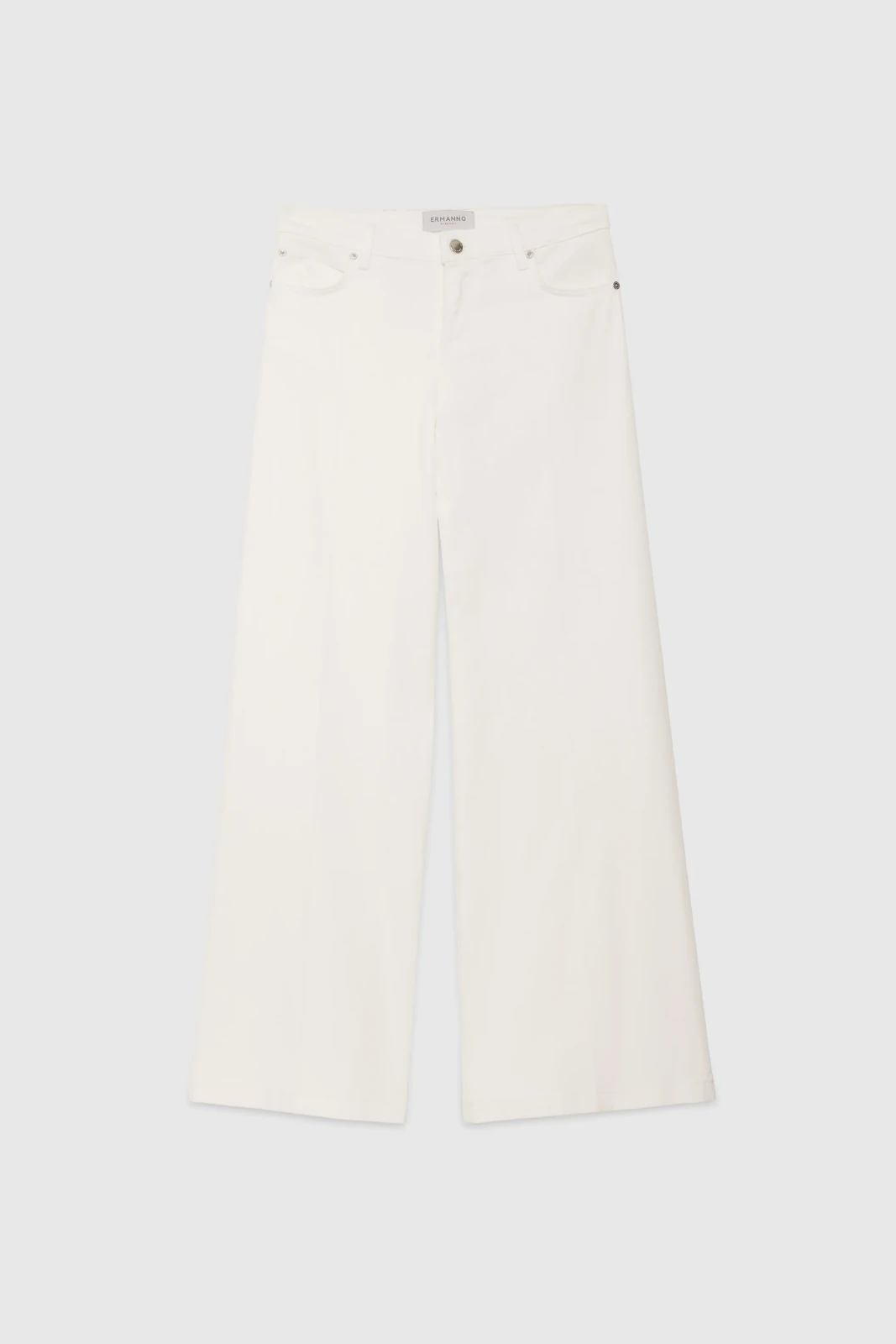 Pantaloni in jeans bianco modello a 5 tasche con gamba ampia sul fondo