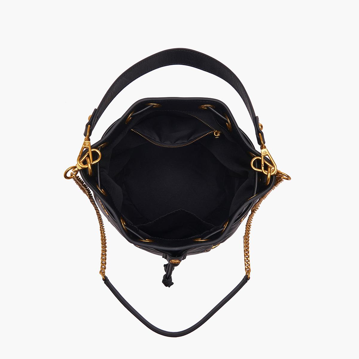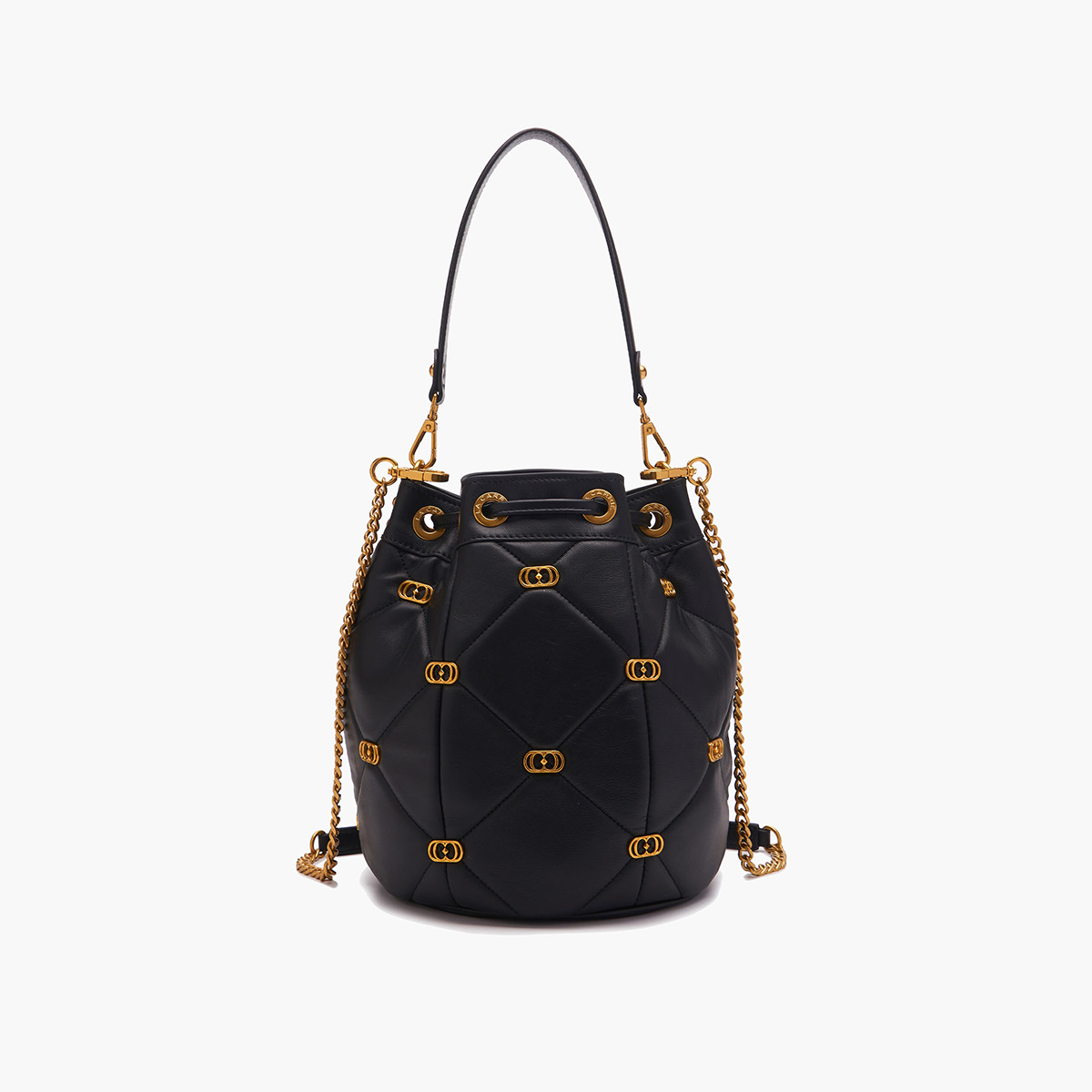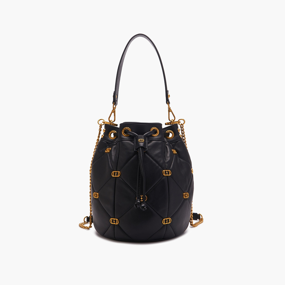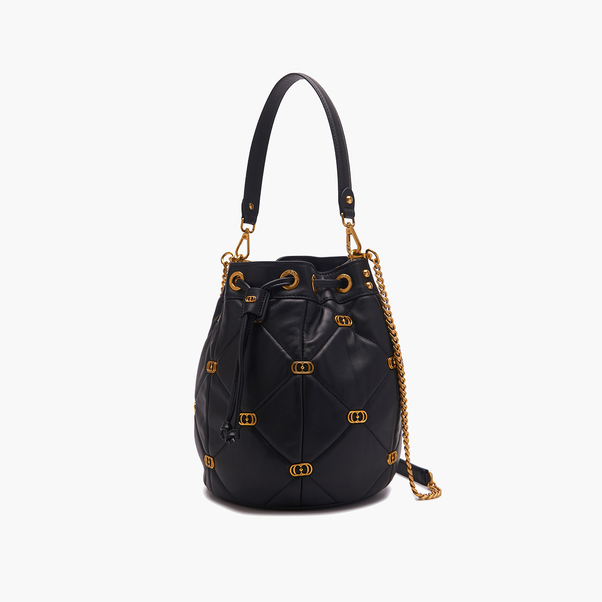 Descrizione: LOGOS GIGI BUCKET LEATHER Secchiello Logos Nero secchiello in pelle nappata con lavorazione trapuntata e piccoli loghi metallici applicati sugli incroci delle impunture, manico in pelle e tracolla di catena. DIMENSIONI 26×22×26.5